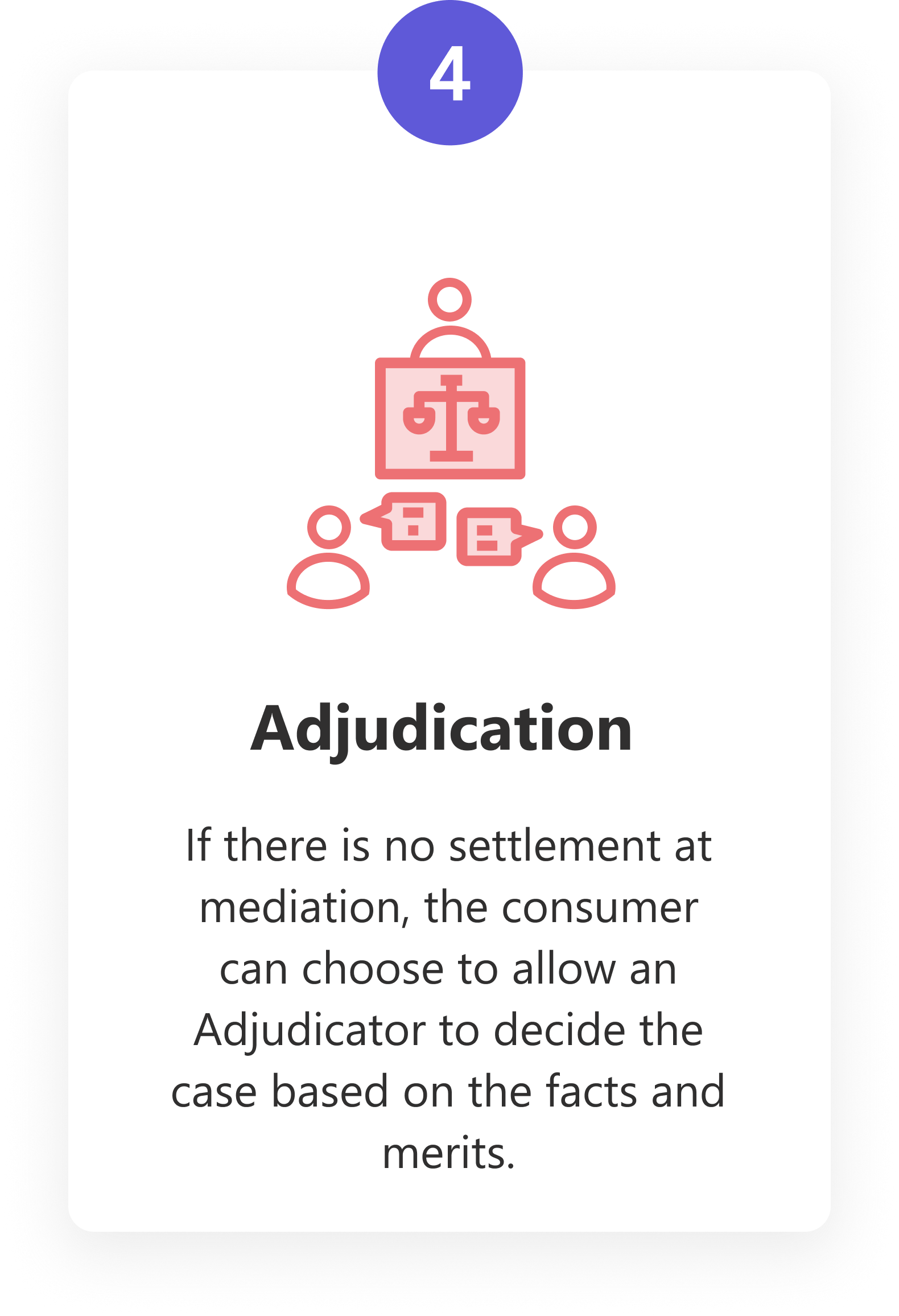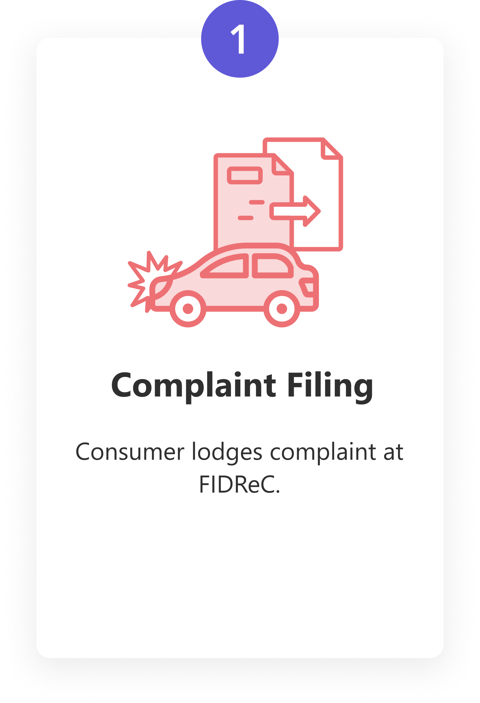 Our process starts with consumers filing a complaint against financial institutions subscribed to FIDReC. If the complaint is within FIDReC's jurisdiction, the claim proceeds to mediation. If there is no settlement at mediation, the consumer can choose to bring the claim to the final stage of FIDReC's process - adjudication.