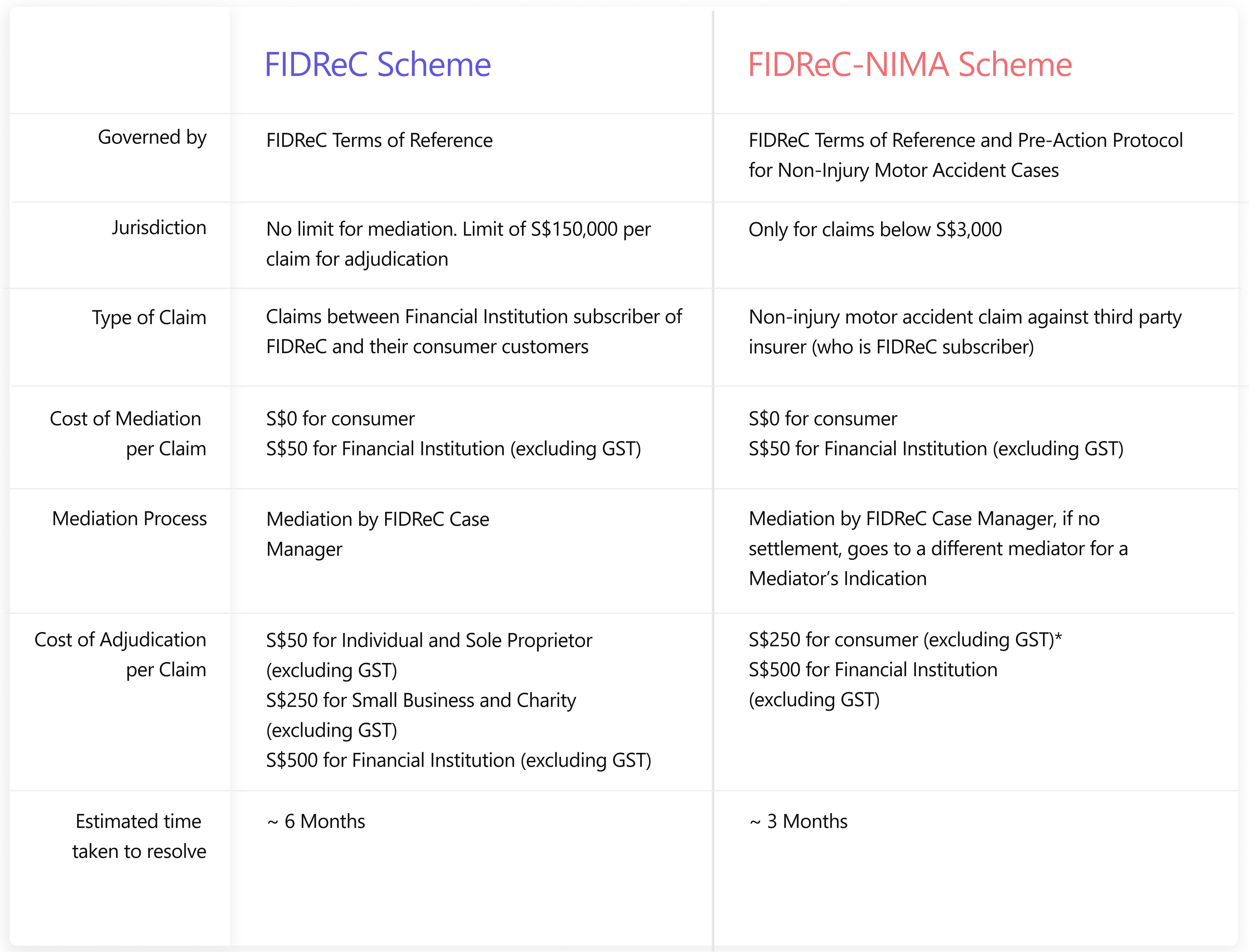 disputes with insurance companies in which the amount claimed is below S$3,000. The FIDReC-NIMA Scheme covers claims by complainants